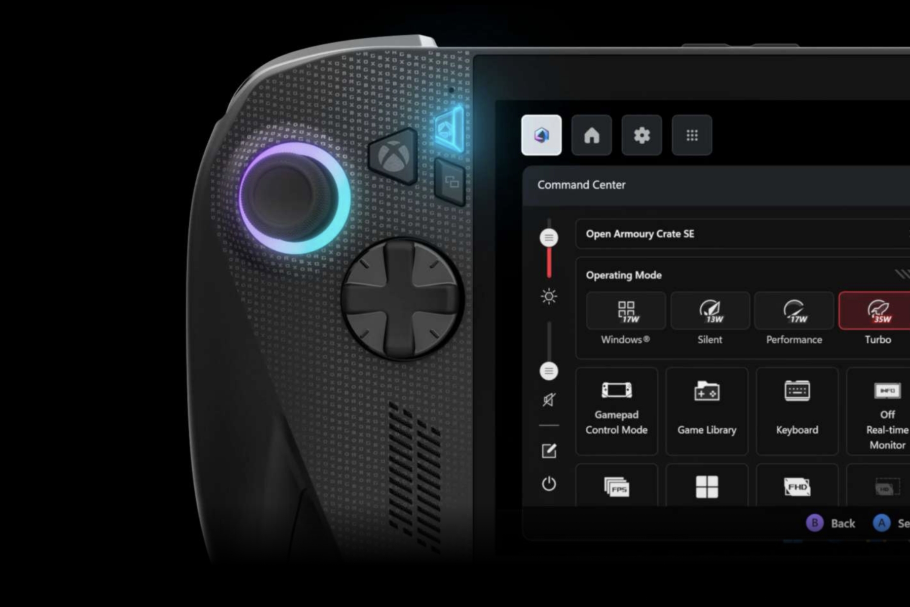 ROG Xbox Ally надає вам повний контроль над ігровим процесом, дозволяючи налаштувати кожен аспект гри за допомогою програмного центру Armoury Crate SE. Він керує функціями Ally за допомогою уніфікованої платформи, призначеної для оптимізації параметрів пристрою та пропонує спрощений інтерфейс для налаштування режимів роботи, кривих вентиляторів, чутливості джойстика та багато іншого.