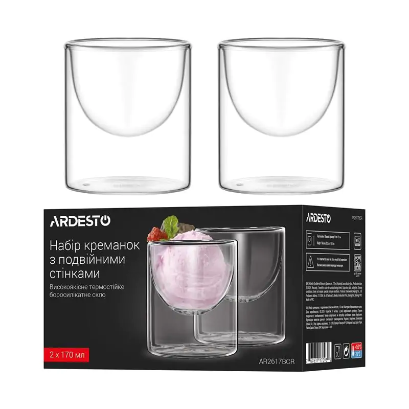 Набір креманок з подвійними стінками Ardesto, 170мл, 2шт, боросилікатне скло, прозорий
