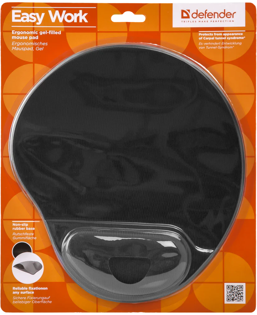 Килимок Defender Easy Work (50905) має спеціальну подушечку під зап'ястя, наповнену гелем, завдяки якій рука менше втомлюється при роботі. Цей килимок сумісний з лазерними й оптичними мишками, а також має тонку, але міцну конструкцію.