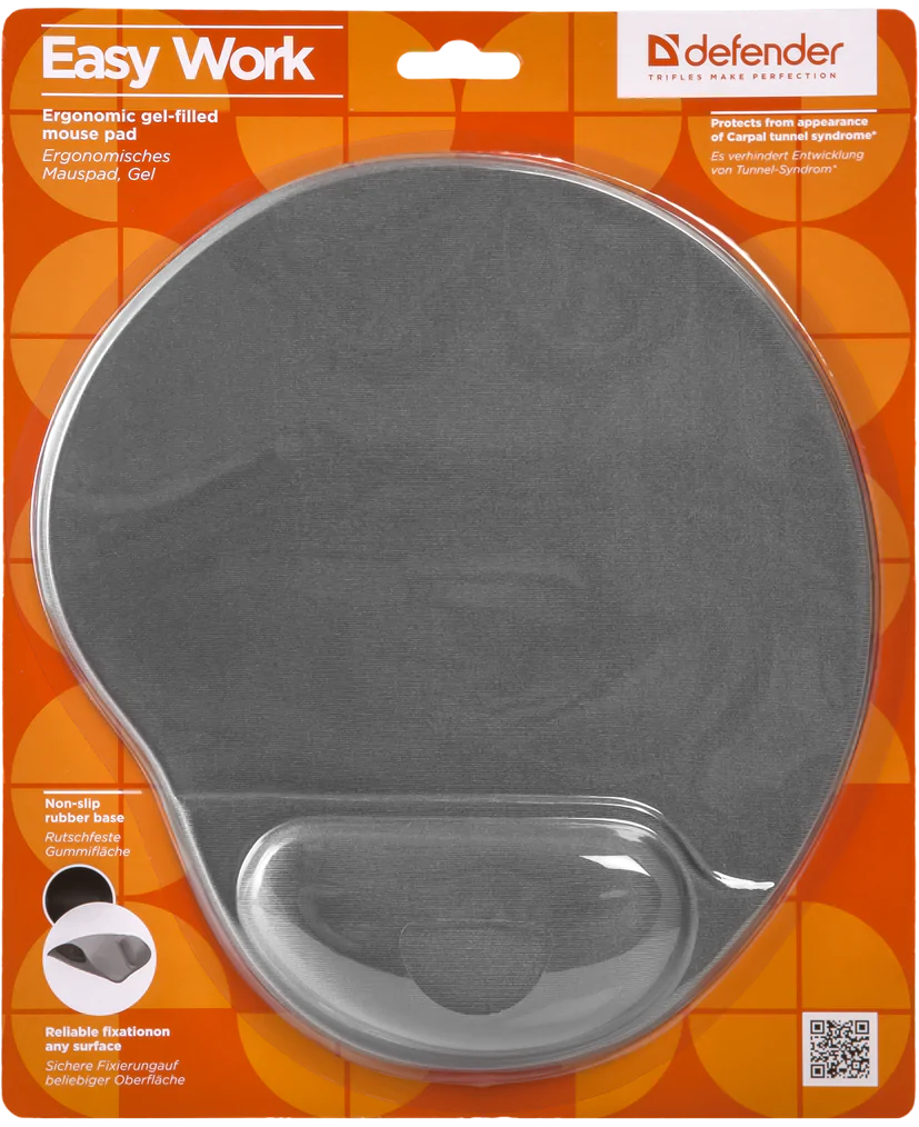 Килимок Defender Easy Work (50905) має спеціальну подушечку під зап'ястя, наповнену гелем, завдяки якій рука менше втомлюється при роботі. Цей килимок сумісний з лазерними й оптичними мишками, а також має тонку, але міцну конструкцію.