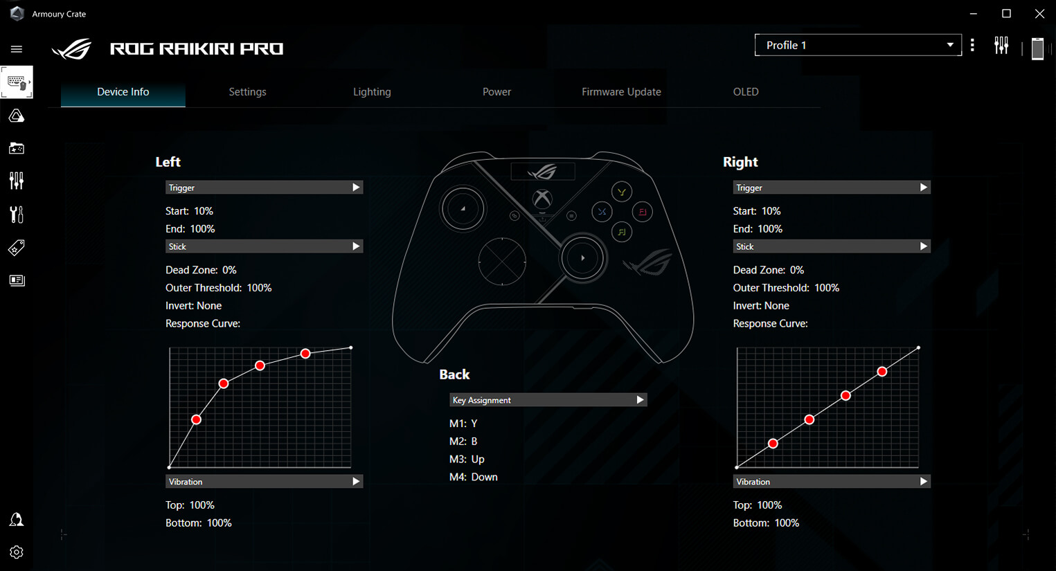 С помощью ПО Armory Crate элементы управления можно настроить в соответствии с вашим игровым стилем или с особенностями любой игры. Доступны разнообразные способы настройки: переназначение кнопок, настройка параметров OLED-дисплея, выбор профилей контроллера, настройка уведомлений о низком заряде в беспроводном режиме и тд. Вы также можете подобрать оптимальную силу вибрации, активировать "мертвые зоны", а также настроить кривые обратной связи джойстика.