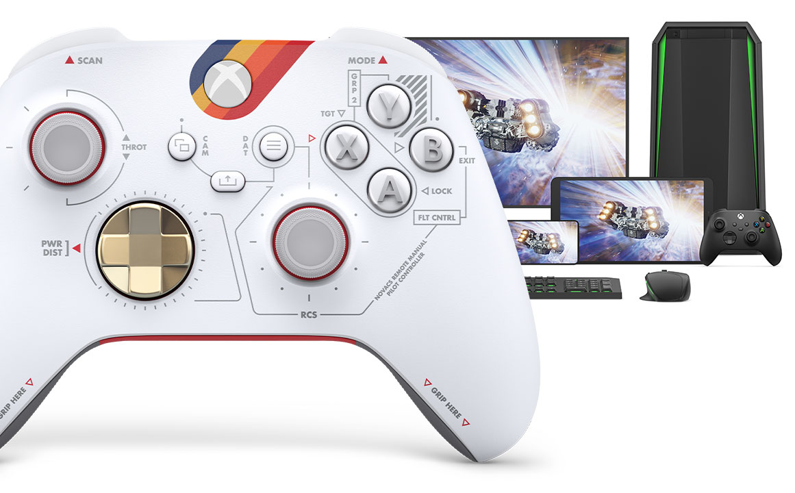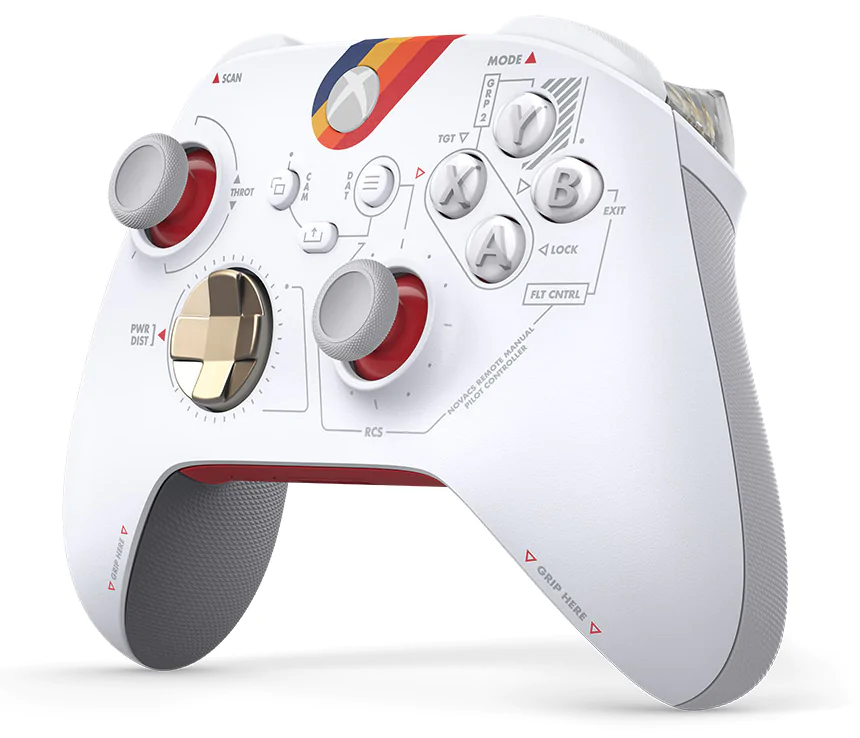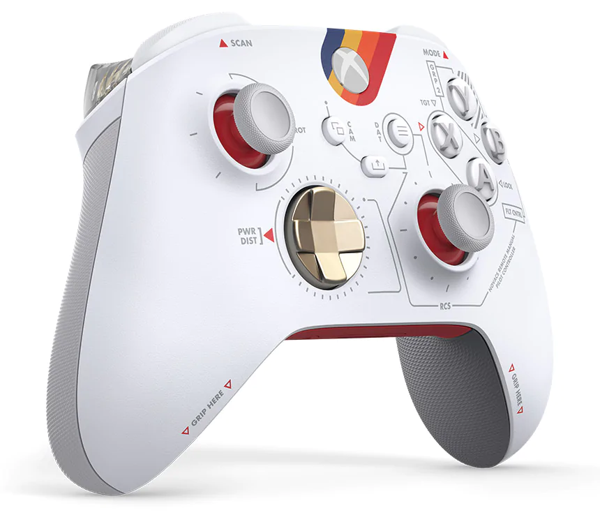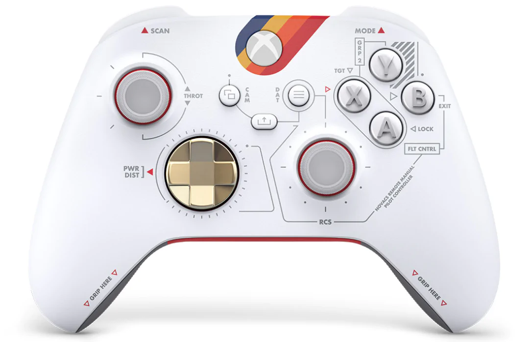 Бронзово-металлический D-pad дополняет чистый техничный дизайн белого верхнего корпуса. Цветной рисунок в стиле Constellation служит визуальным напоминанием про эпичное приключение, которое ждет всех в Starfield.