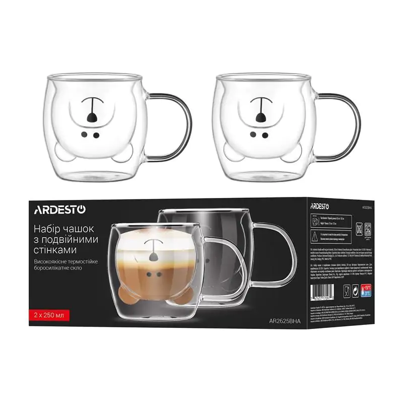 Набір чашок з ручками і подвійними стінками Ardesto Animals, 250мл, 2шт, боросилікатне скло, прозорий