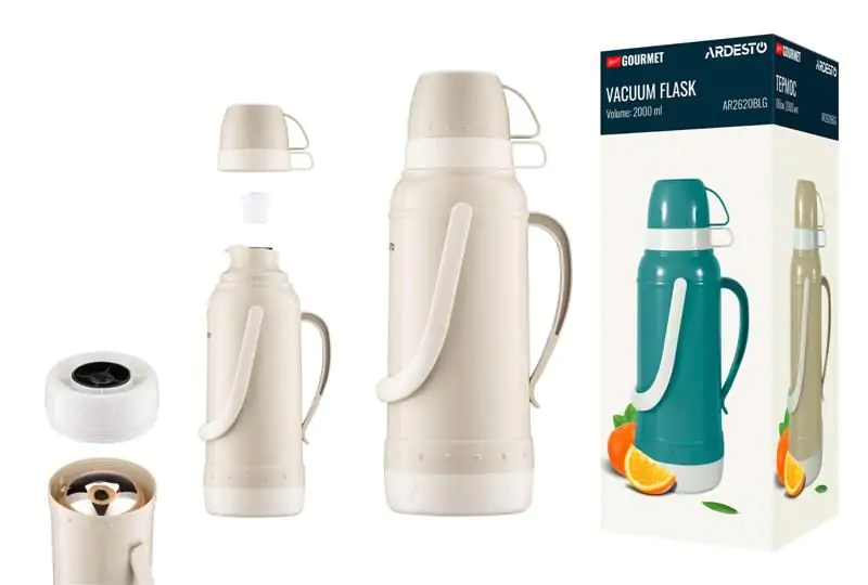 <p>Матеріал: пластик.<br /> Матеріал колби: скло.<br /> Об'єм: 2000 мл.<br /> Механізм відкривання: кришка з різьбою.<br /> 2 чашки в комплекті. Об'єм чашок: 300 мл, 420 мл.<br /> Колір: бежевий.Діаметр: 13,5 см.<br /> Висота: 39,4 см.<br /> Збереження температури: гарячий напій - 24 години, холодний - 24 години. Упаковка: кольорова коробка.<br /> Очищення в посудомийній машині: ні.<br /> Гарантія: 1 місяць у випадку виробничого дефекту.<br /> Термін придатності: не обмежений, не потребує особливих умов зберігання.<br /> Країна виробництва: Китай.</p>