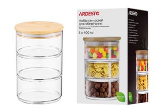 Набір ємностей для зберігання Ardesto Midori, 3х400мл, боросилікатне скло, бамбук, прозорий