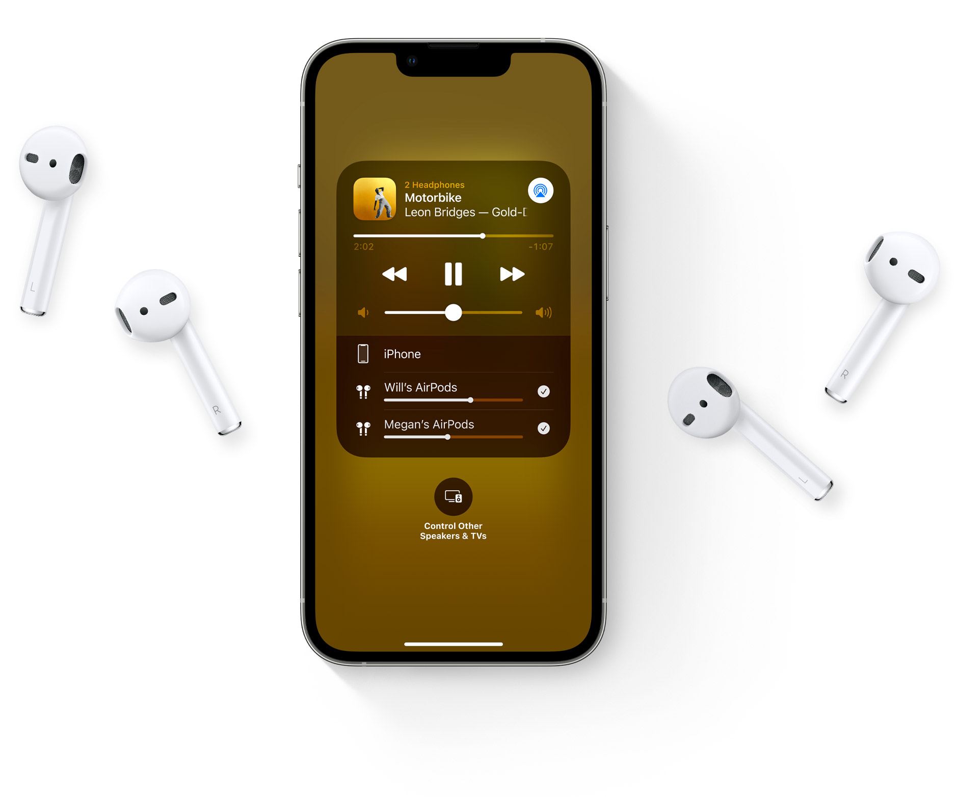 Функция «Общее аудио» дает возможность слушать музыку, подкасты и другое аудио вместе через две пары AirPods, а громкость для каждой пары наушников можно регулировать отдельно. Если ваши AirPods в футляре, поднесите их к iPhone или iPad, с которого транслируется контент, и установите соединение одним касанием. А если вы уже надели AirPods, просто поднесите к ним iPhone.