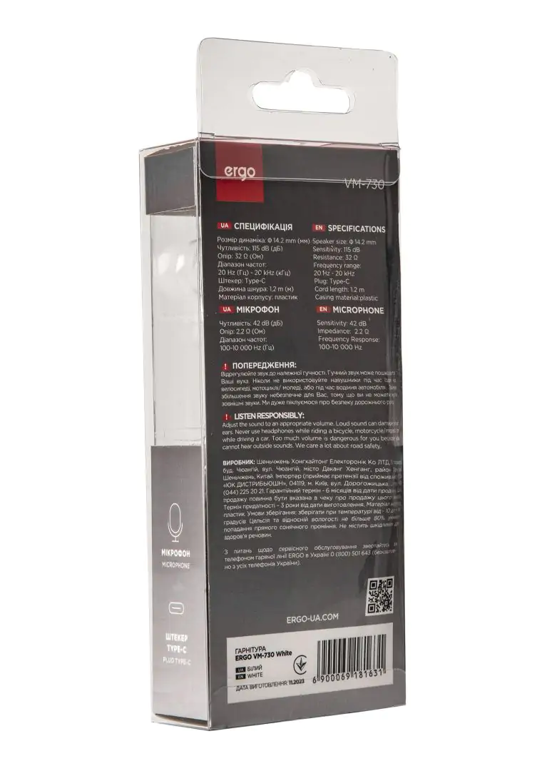 Модель ERGO VM-730 TYPE-C являє собою повнофункціональну дротову гарнітуру у форматі вкладишів, яка для своєї роботи не потребує підзаряджання і з’єднується з джерелом звуку за допомогою порту USB Type-C. Це дозволяє використовувати дані навушники з тими сучасними смартфонами, планшетами та ноутбуками, де не передбачено класичний аудіороз’єм 3,5 мм. Два варіанти кольорового забарвлення – чорний і білий – допоможуть підібрати відповідний дизайн до власних потреб і вподобань.