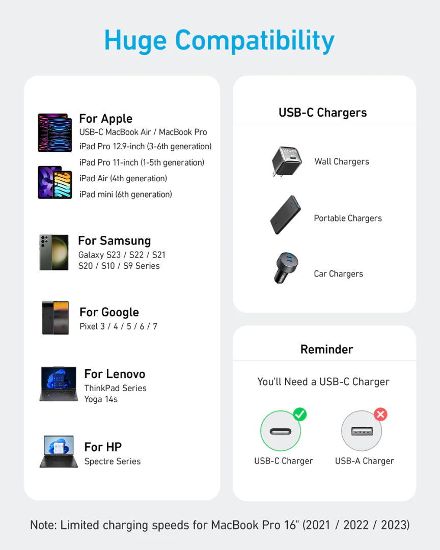 Заряджайте без обмежень Від MacBook до iPad, телефонів Samsung тощо, цей кабель Anker USB-C пропонує рішення для заряджання, яке підходить для різноманітних пристроїв.