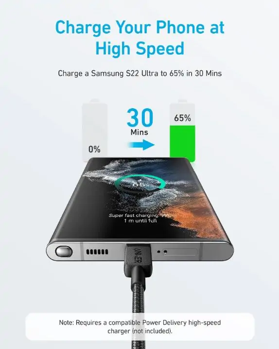 Швидке заряджання Підтримує максимальну вихідну потужність 60 Вт або більше для живлення практично будь-якого пристрою USB-C, включно з телефонами, планшетами та ноутбуками (за умови використання зарядного пристрою на 60 Вт або більше.
