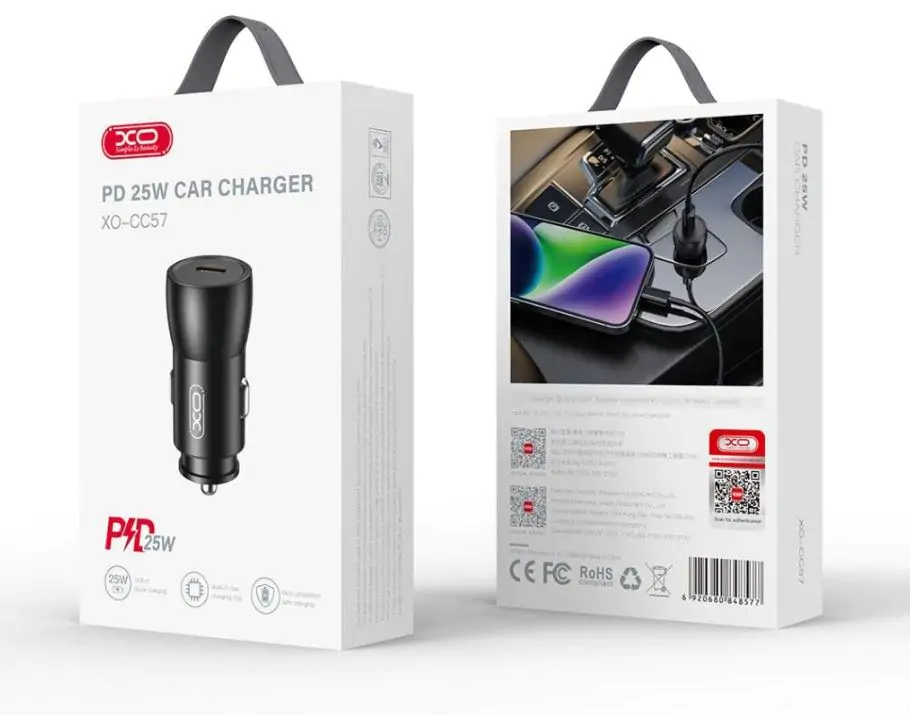 XO CC57 швидкісний автомобільний зарядний пристрій виконаний в металевому корпусі та оснащений 1 портом USB-C потужністью до 25 Вт.