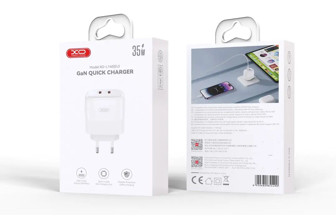 Універсальний мережевий зарядний пристрій XO L140 має два порти USB-C Programmable PowerSupply (PPS) / Power Delivery (PD) потужністю до 33Вт.