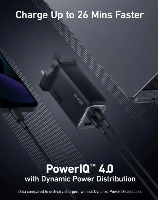 На платформі GaNPrime Оснащений найдосконалішою системою заряджання Anker на основі GaN, яка має інноваційну багатошарову архітектуру, PowerIQ 4.0 для підвищення ефективності та ActiveShield 2.0 для інтелектуального моніторингу температури.