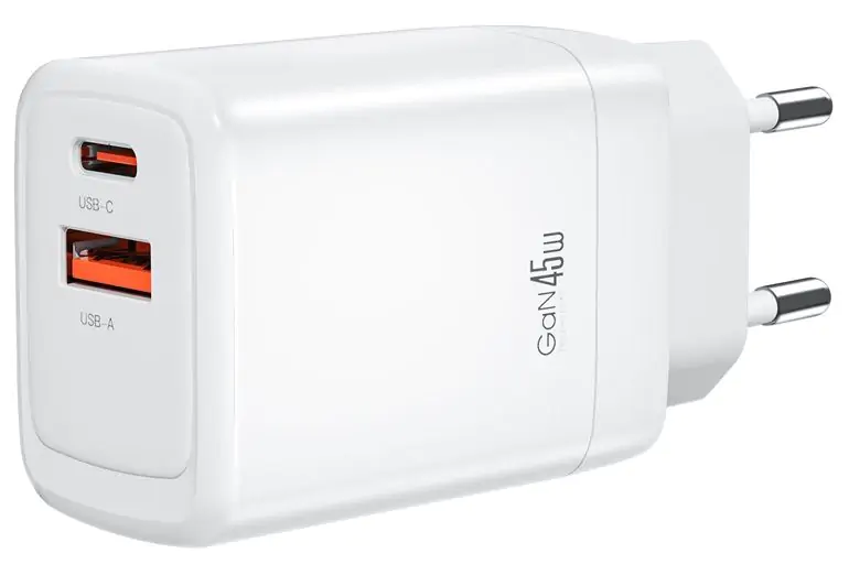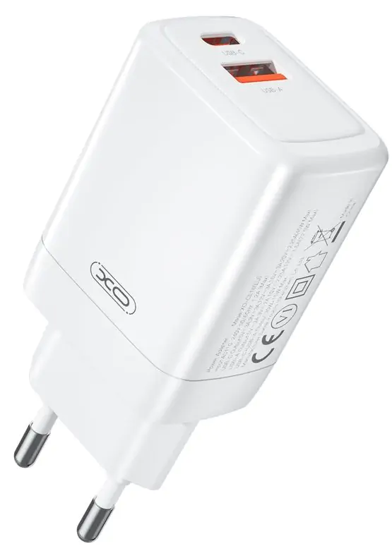 Універсальний мережевий зарядний пристрій XO CE16 має два порти - один USB-C Programmable PowerSupply (PPS) / Power Delivery (PD) потужністю 45Вт та один USB-A Quick Charge (QC) 22.5Вт.