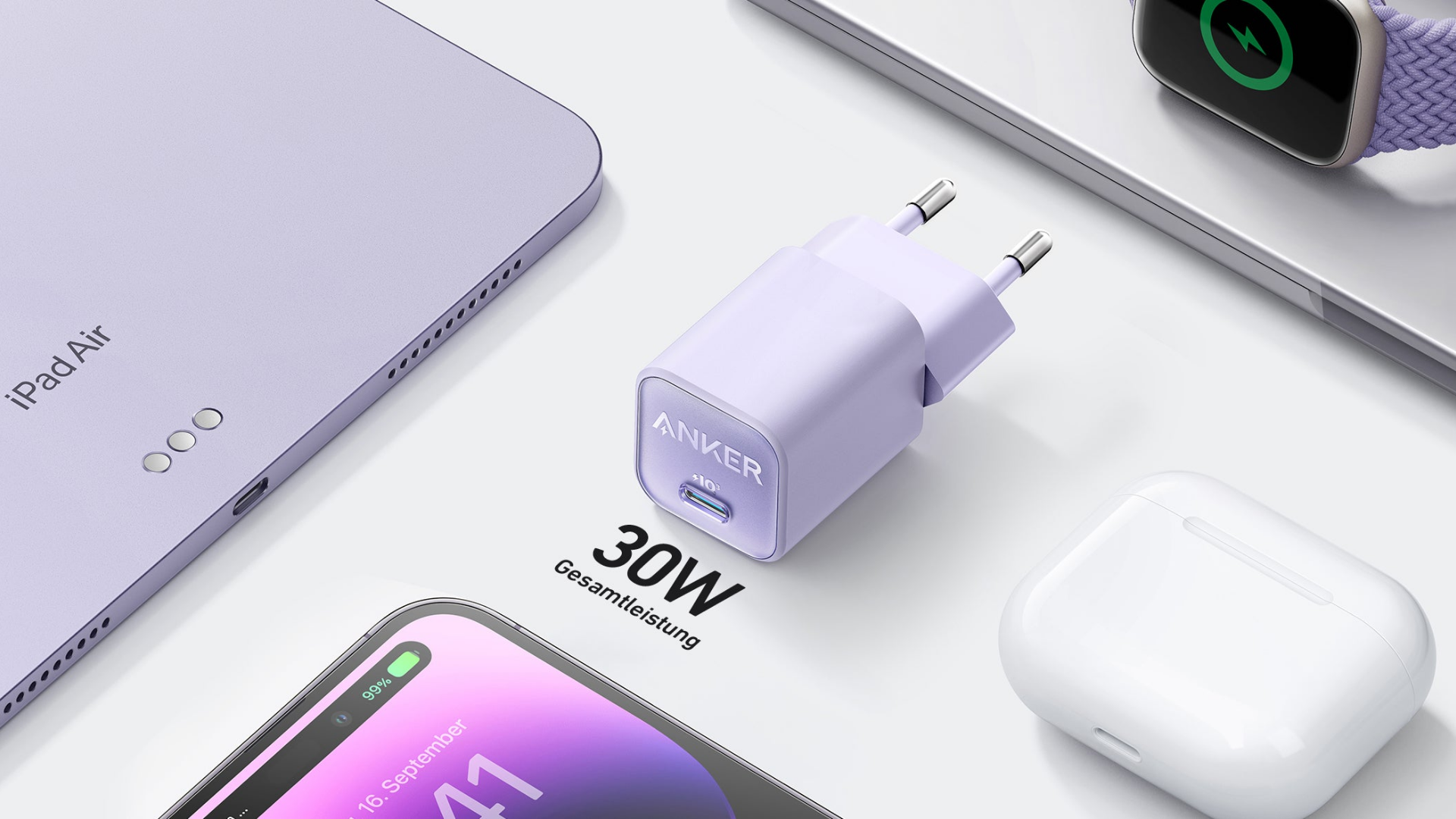 Заряжайте любые девайсы, от наушников для ноутбука, только одним сетевым адаптером мощностью 30 Вт.
