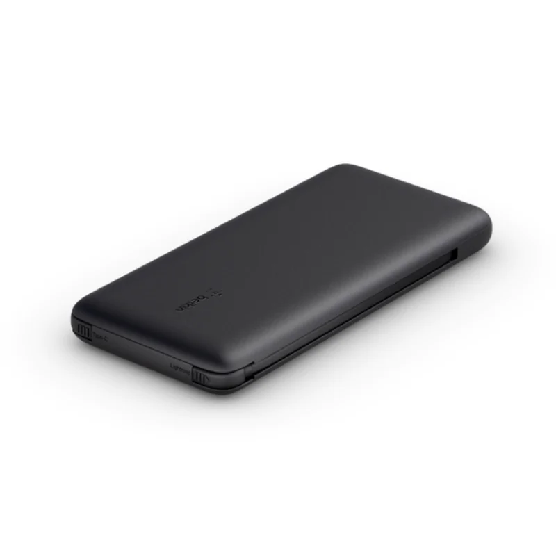 Во внешний аккумулятор Belkin Integrated BoostCharge Plus с ёмкостью 10 000 мА/ч чёрного цвета встроенны кабели USB-C и Lightning так что вам не прийдется больше носить с собой лишние провода, а еще вы можете одновременно заряжать два устройства и сам повербанк.