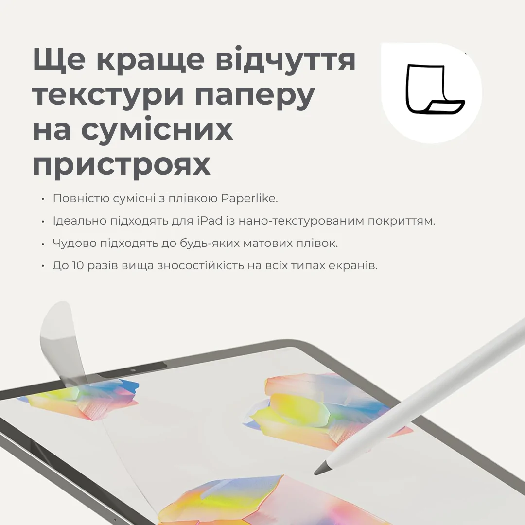 Разработанные для идеальной работы с плёнкой Paperlike или дисплеем с нанотекстурой, эти прочные наконечники усиливают тактильную отдачу, делая письмо и рисование похожими на работу по более грубой бумаге.